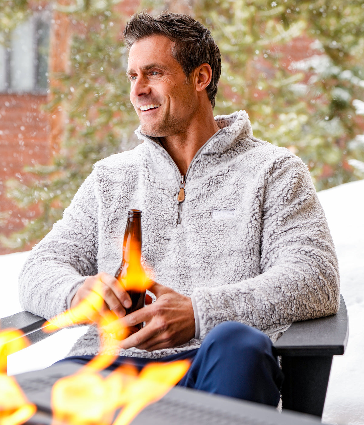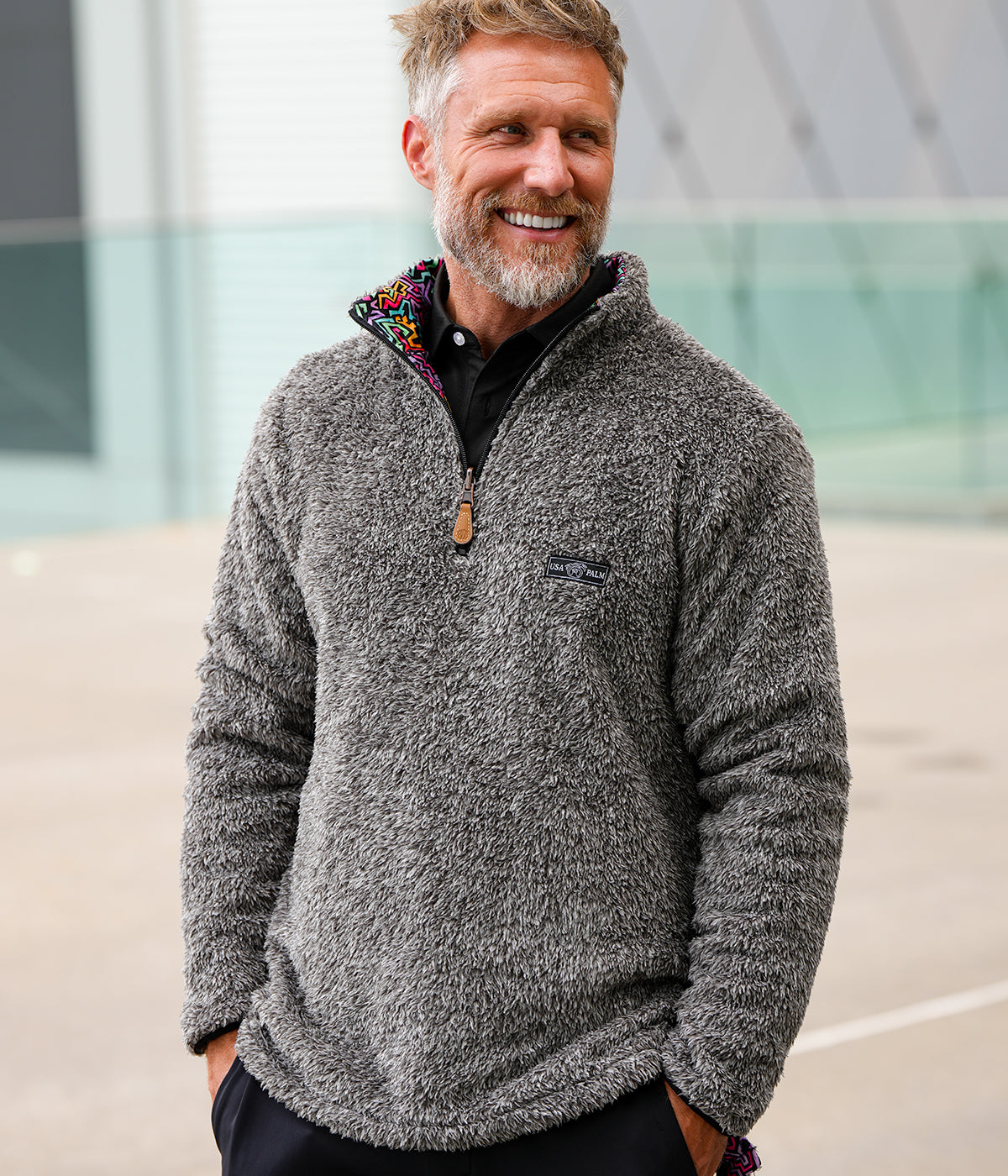 insulating plush sherpa on one side, breathable smooth performance fabric on the other for all-day warmth and versatility.